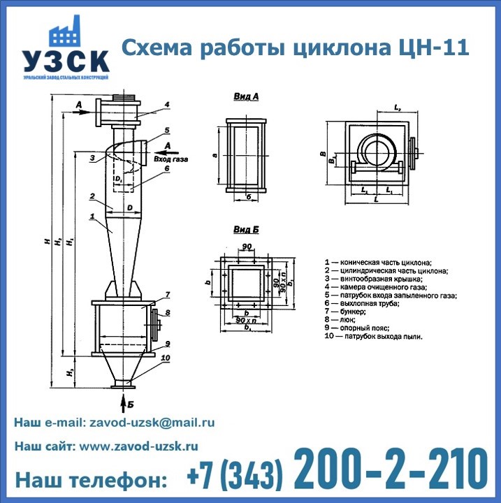 При этом ощутимой разницы в цене между универсальным и узконаправленным, подобранным в соответствии с конкретными техническими требованиями циклоном, нет. Стоимость воздухоочистительного оборудования типа циклон обусловлена маркой и толщиной стали, из которого он изготовлен, сложностью и специфичностью конструкции, наличием дополнительного оснащения (бункер, улитка и другие). При необходимости, на заводе УЗСК в Новочеркасске будет изготовлен циклон по индивидуальным техническим чертежам заказчика.