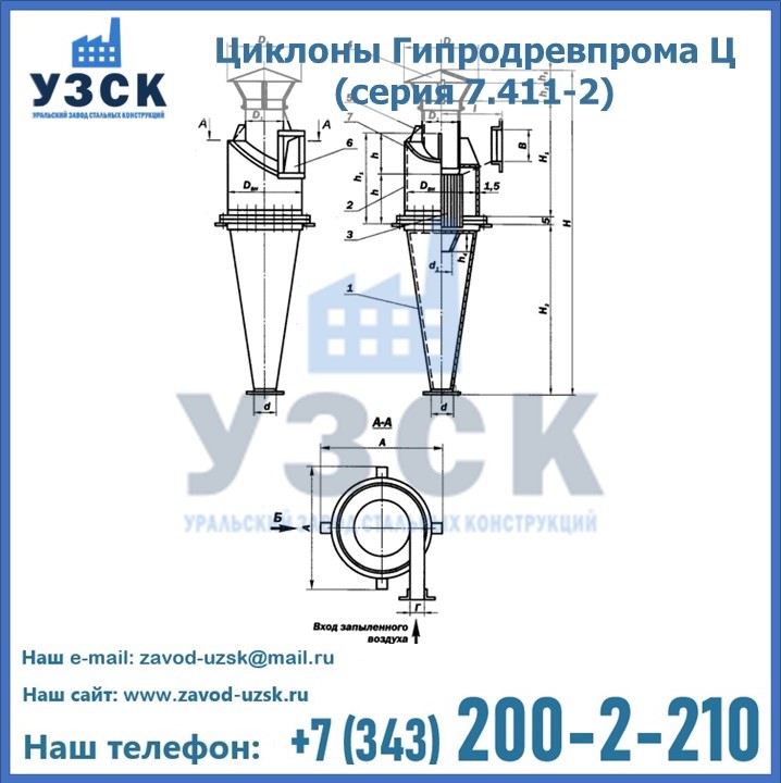 Циклоны Гипродревпрома Ц (серия 7.411-2) высокого качества можно купить в компании «УЗСК» в Новочеркасске. Наши специалисты предоставят всю необходимую информацию информацию и помогут с выбором модели циклона. Подробные технические характеристики, конструкцию, параметры, ассортимент и стоимость продукции можно также найти на сайте УЗСК.