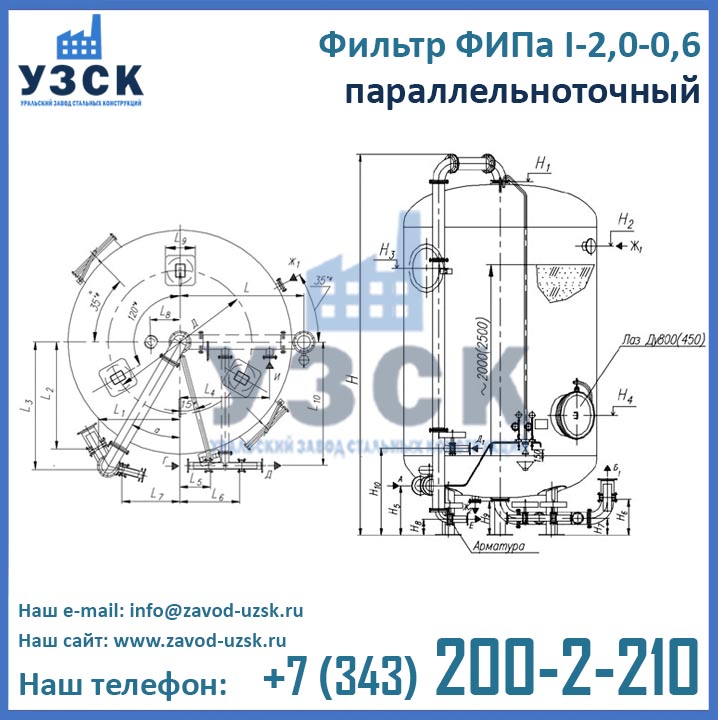 Уральский Завод Стальных Конструкций осуществляет изготовление ионитных фильтров ФИПа любого типоразмера в соответствии с нормами и требованиями ГОСТ. Завод УЗСК располагает собственным аттестованным гидростендом, на котором производятся гидрологические испытания готового оборудования. Фильтры ФИПа I 2,0-0,6 испытываются при подаче пробного давления 0,9 МПа.