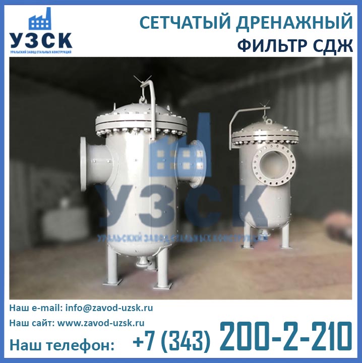 На формирование цены дренажного фильтра влияют следующие факторы: материальное исполнение, конструктивное исполнение, стоимость сырья в момент изготовления, комплектация, необходимость доставки в другой населенный пункт, срочность выполнения работ по изготовлению, прочие предпочтения заказчика. Уральский завод стальных конструкций изготавливает фильтры СДЖ-700 любого типового исполнения, а также нестандартные фильтры СДЖ 700 мм по чертежам заказчика или техническому заданию. Дополнительно к фильтрам СДЖ у нас Вы можете заказать сменные фильтрующие элементы любой тонкости фильтрации, ответные фланцы, прокладки и крепеж. По запросу изготавливаем также фильтры СДЖ-К-700 с концевым затвором. Для того чтобы узнать какова цена на фильтр СДЖ Ду700 в Новочеркасске с необходимыми Вам характеристиками, отправьте запрос в отдел продаж завода УЗСК по координатам, указанным в разделе «Контакты».