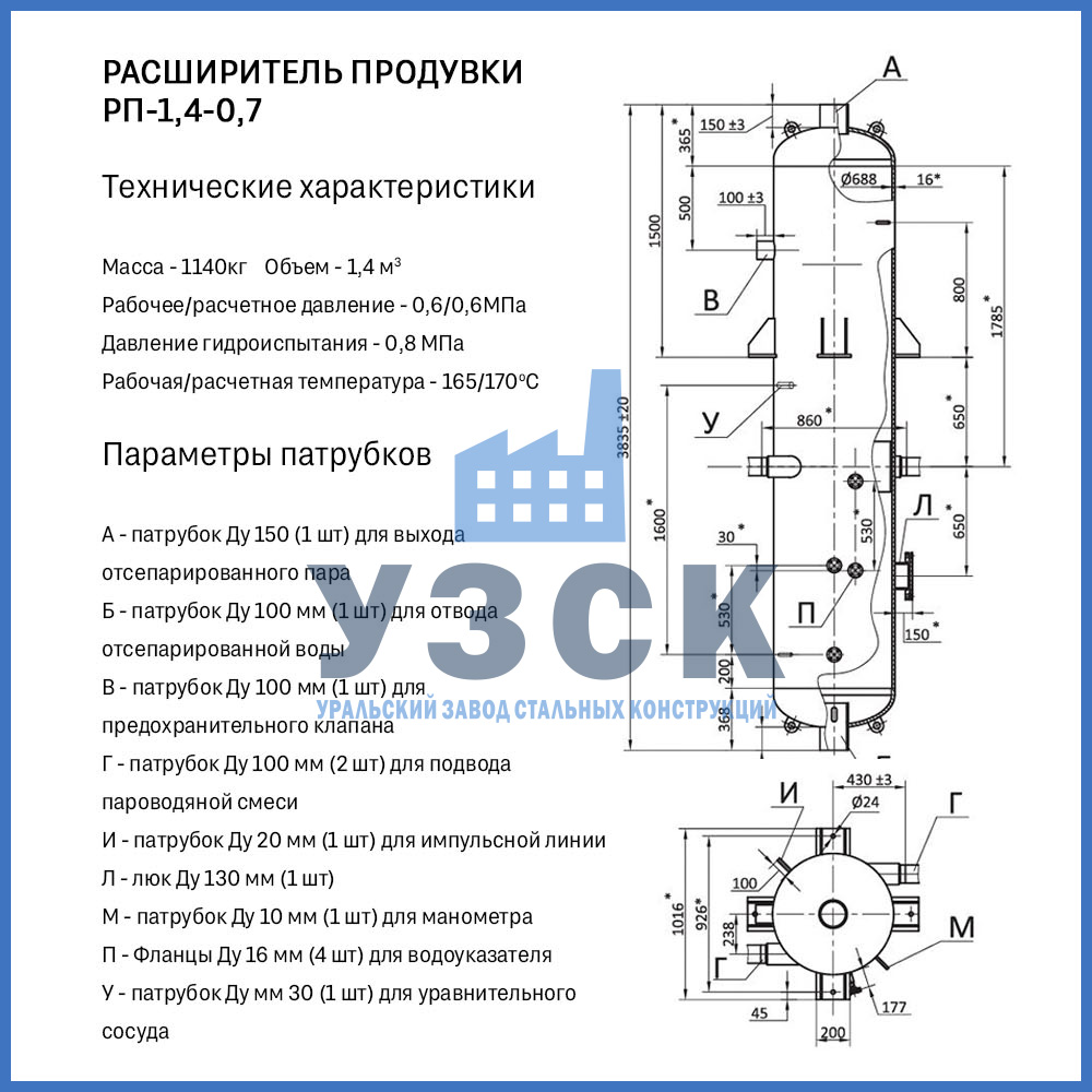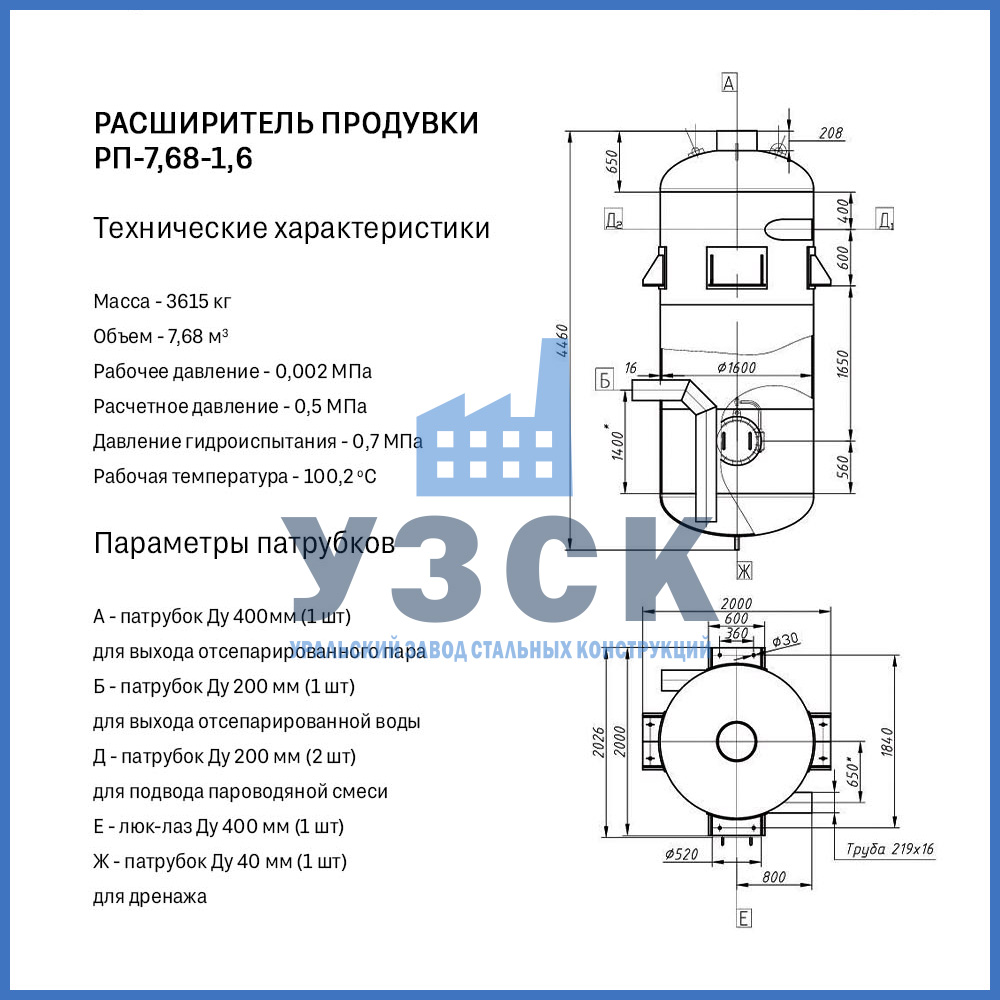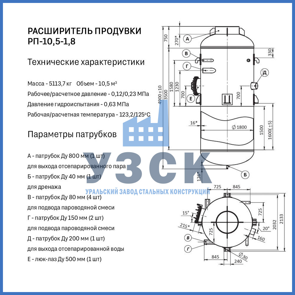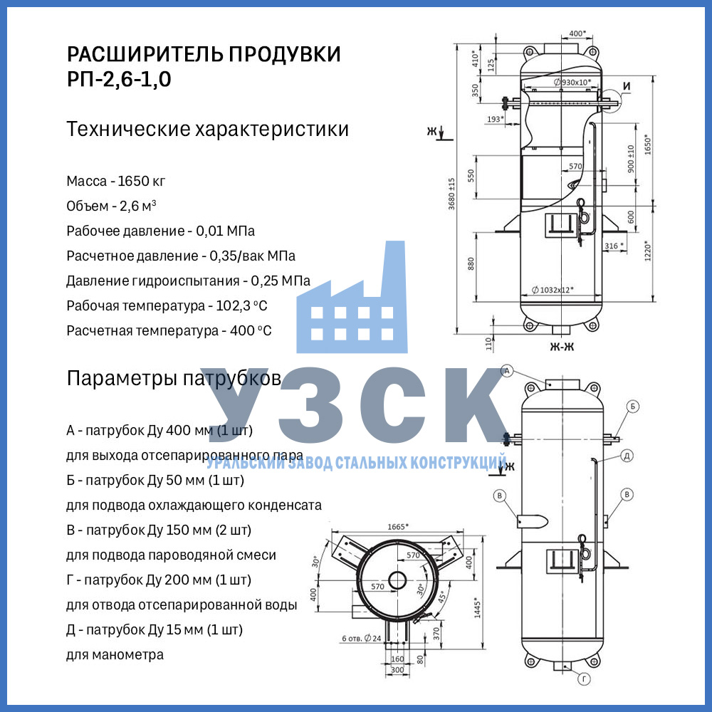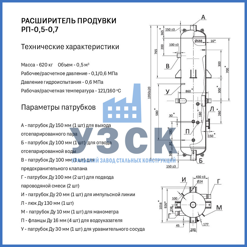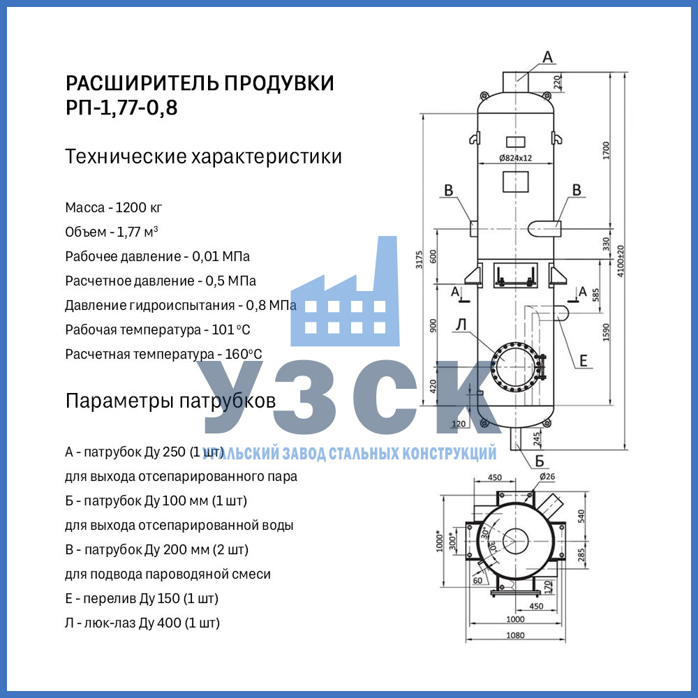 Конструктивно расширитель продувки (РП) — это вертикальный цилиндрический сосуд, изготавливаемый из стальной обечайки с эллиптическими днищами. Стандартная комплектация включает: